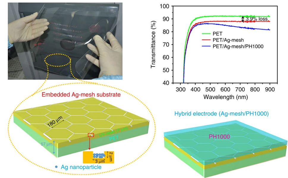 个人消费电子产品的广泛应用引发了对轻便、机械灵活的便携式电源的巨大需求。钙钛矿太阳能电池兼具低成本和高性能。本文在高度柔性和超薄的银网/导电聚合物衬底上构建了高性能平面异质结钙钛矿太阳能电池。基于57 μm厚的聚对苯二甲酸乙二醇酯基板,器件性能可与刚性玻璃/氧化铟锡基板相媲美,光电转换效率达到14.0%,而比功率(功率与器件重量之比)达到1.96 kW kg−1。该柔性装置在抗机械变形方面也表现出优异的稳定性,在5000次完全弯曲后仍能保持95%的初始效率。该研究结果证实,钙钛矿薄膜与所开发的柔性衬底完全兼容,在柔性和可弯曲太阳能电池中展现出广阔的应用前景。