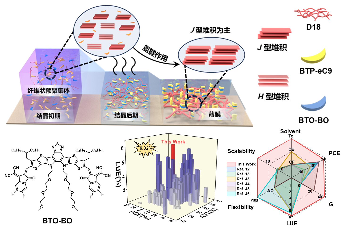 半透明有机太阳能电池中给体和受体材料的分子堆积决定了平均可见光透过率(AVT)和能量转换效率(PCE)之间的权衡,这严重制约了光利用率(LUE)的提高。基于此,苏州大学李耀文教授等人通过精心设计主客体活性层调控分子堆积,进而同时提高AVTPCE。对各种主给体和客体材料组合的系统研究表明,具有更多缺电子氢原子的给体材料倾向于与具有富电子氧原子的客体材料形成C─H···O相互作用。主给体D18和客体BTO-BO之间的氢键相互作用促进了给体分子堆积模式在结晶过程中从混合的J型和H型转变为以J型堆积为主,从而显著减少了可见光吸收并增强了空穴传输。此外,BTO-BO可作为主受体BTP-eC9的成核剂,以增加活性层的结晶度和吸收系数,从而增强近红外光吸收。经过光调制后,甲苯制备的半透明器件同时提高了PCEAVT,实现了创纪录的6.02%LUE值得注意的是,这种主客体活性层与柔性设备具有出色的兼容性,并有望在温室光伏应用中实现可扩展性。