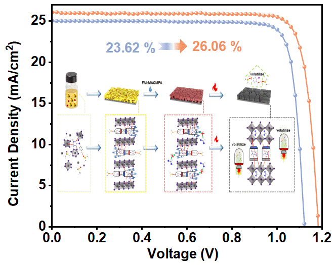 本文创新性地提出分子“推进器”的概念,通过引入一种具有三个羰基和一个C--I+键的高价碘(III)化合物13-二甲基-5-(苯基λ3-碘亚基)嘧啶-2,4,6(1H,3H,5H)-三酮(DPIPT),对钙钛矿薄膜生长动力学进行程序化调节。具体如下:Step 1. DPIPT中的三个羰基与PbI2存在强配位作用,能够有效减缓FAIPbI2之间的反应速率,防止室温下δ-FAPbI3的形成;Step 2.在薄膜退火过程中,随着温度的升高,DPIPT中的C--I键断裂,生成易挥发的碘苯(IB)以及不可挥发的富电子的卡宾化合物1,3-二甲基嘧啶-5-亚基-2,4,6(1H,3H,5H)-三酮(DPYT)。易挥发的IB与薄膜内部残留的溶剂DMSO会形成共沸物,携带DMSO从薄膜底部逸出,促进钙钛矿生长,消除薄膜底部的空隙;Step 3.另外一个分解产物——富电子的卡宾化合物DPYT,能够有效钝化薄膜内部未配位的Pb2+缺陷,并锚定在晶界上而不会发生迁移扩散。最终,获得了相纯度高、致密、低缺陷的高质量钙钛矿薄膜。在0.0621.004-cm²pero-SC中分别实现了高达26.06%(认证为25.79%)和24.65%的光电转化效率