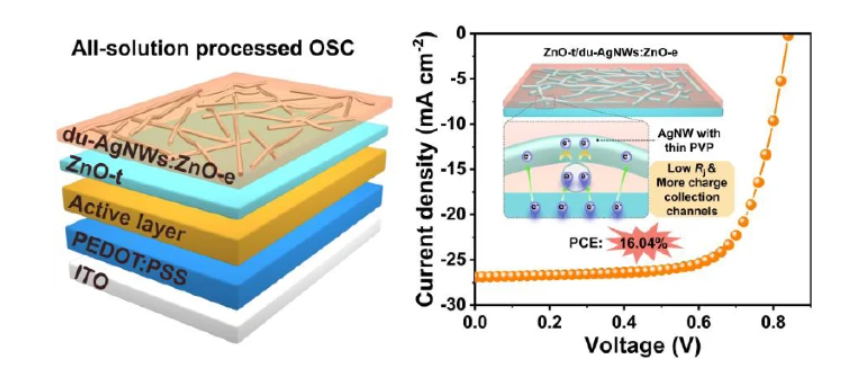 全溶液加工的有机太阳能电池是可印刷光伏电池的最终目标,但由于顶部电极接触不良而产生的电损耗极大地限制了效率的提高。为了解决该问题,苏州大学李耀文教授等人利用银纳米线(AgNWs)作为骨架,氧化锌纳米粒子(ZnO-NPs)作为基质构建了溶液加工的混合顶电极。在构建骨架时,首先采用旋涂冲洗处理来减少包裹在AgNW周围的残留的绝缘聚乙烯吡咯烷酮,以促进骨架中AgNW之间的紧密接触。然后,将ZnO-NPs沉积到AgNWs骨架上,桥接AgNWs骨架与底层ZnO-NPs电子传输层(ETL)。底层ZnO-NPs ETL还可以诱导ZnO-NPs基质的生长,以最大限度地减少晶格失配,从而创建从ETLAgNWs骨架的额外传输通道以进行高效的电荷收集。最终所获得的电极显著增强了器件中的电学接触,刚性和柔性全溶液处理的OSCs分别获得了创纪录的16.04%14.54%的功率转换效率。