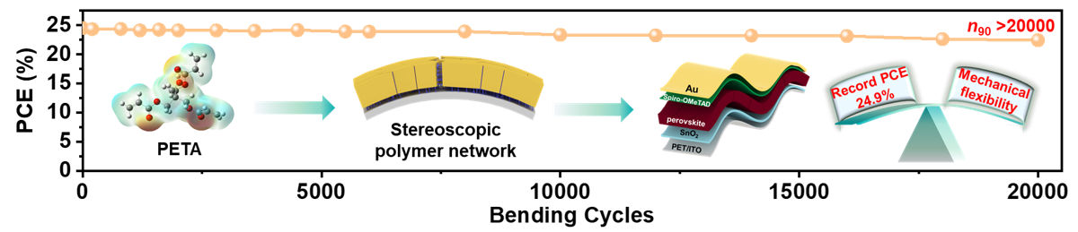 为了同时抑制钙钛矿内部的初始裂纹以及界面处的剥离裂纹,本文引入了具有三个立体交联位点的交联分子——季戊四醇三丙烯酸酯(PETA),在器件内部自上而下构筑了“界面-体相”三维立体聚合物网络。研究发现,该网络在降低钙钛矿薄膜杨氏模量,抑制体相初始裂纹的同时,增强了界面韧性,阻碍了界面剥离裂纹的生成。基于PETA所得到的柔性pero-SCs在经历20000次连续弯曲后,仍保持其初始光电转换效率(PCE)的92%。值得注意的是,该聚合物网络结构还能辅助钙钛矿晶粒在柔性衬底上生长,因此柔性器件还表现出24.9%(认证为24.48%)的高PCE。