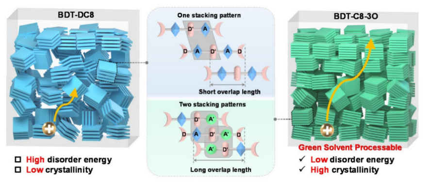 本文通过引入不对称极性低聚乙二醇(OEG)侧链,设计了一种非对称线性有机小分子BDT-C8-3O。极性OEG侧链具有较高的极性和构象灵活性,不仅使BDT-C8-3O在天然非芳香族化合物溶剂3-甲基环己酮(3-MC)等绿色溶剂中具有较好的溶解度,而且诱导共轭主链表现出两种主要的堆积模式,并且均表现出π-π堆积的增强。从而促进HTL材料分子在绿色溶剂中有序组装,得到的非掺杂BDT-C8-3O薄膜具有高结晶度、高空穴迁移率和低无序能。