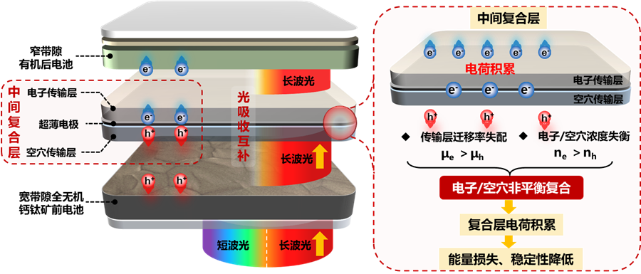 苏州大学材料与化学化工学部李耀文教授课题组(硕士研究生杨海迪)在全无机钙钛矿/有机叠层太阳能电池领域取得新突破。针对中间复合层(ICL)中非平衡电荷复合导致的能量损失问题,本研究提出一种协同载流子管理策略对TSC的载流子输运与复合行为进行调控,首先,通过对电子传输层基底进行改性以提高钙钛矿晶体质量,从而有效抑制了薄膜中的非辐射复合,增加了钙钛矿上表面的空穴浓度;接着构筑了具有准欧姆接触性能的ICL,并显著缩小了钙钛矿与空穴传输层界面处的空间电荷积累区域,大幅降低了空穴提取传输至ICL中的损失。最终该策略有效地缩小了ICL中空穴/电子的浓度差,实现了平衡电荷复合,降低了TSC能量损失