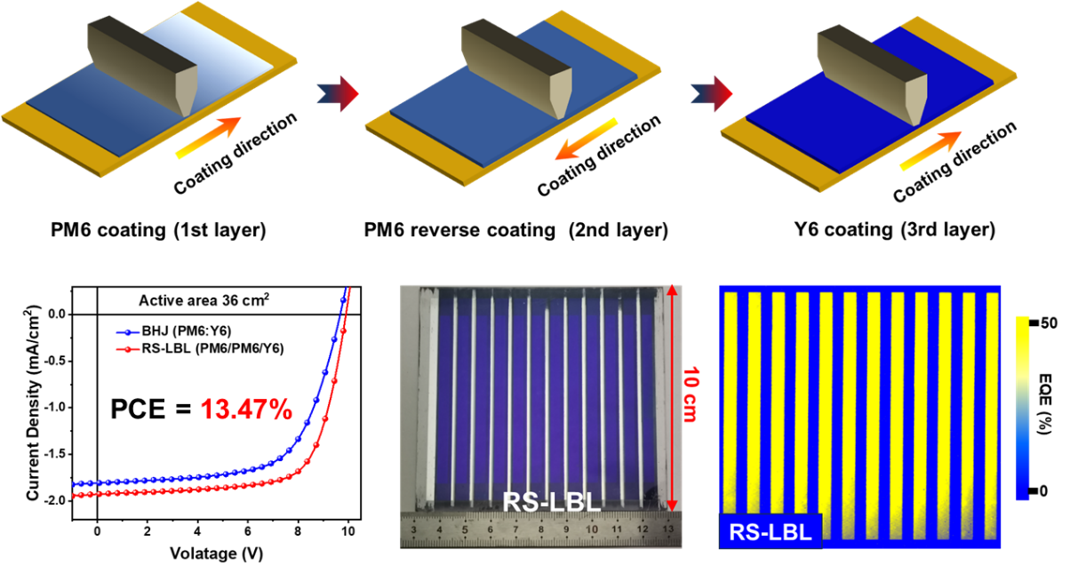 OSCs的大规模制造对工业化至关重要,但小面积OSCs和大面积OSC组件之间仍存在巨大的效率差距,主要原因是基于本体异质结(BHJ)大面积活性层形貌难以调控,且存在不均一的相分布及偏析行为。基于此,苏州大学李耀文等人提出了“可逆逐层刮涂(RS-LBL)”策略,即逐层二次正向/反向刮涂聚合物给体PM6与正向刮涂小分子受体Y6相结合。RS-LBL策略不仅可以精确地控制流体力学,获得了均匀相分布和结晶良好的活性层薄膜,还可以降低活性层中的缺陷密度,促进载流子抽提与传输。最终,基于该策略加工的大面积组件(36 cm2)PCE高达13.47%。