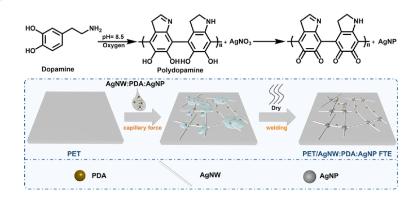 具有强大机械稳定性的柔性透明电极(FTE)对于柔性有机太阳能电池(OSCs)的工业化应用至关重要。然而,平衡FTE的导电性、透射率并提升电极材料对基材的粘附力仍然具有挑战性。在此,苏州大学李耀文教授等人提出了一种增强混凝土策略,该策略使用具有良好粘合性能和适度还原性的聚多巴胺(PDA)微调基于银纳米线(AgNW)FTE的结构。PDAAg+还原成银纳米颗粒(AgNP),这些纳米颗粒在AgNW连接位点像“铆钉”一样生长PDA稳定了AgNW骨架,并提高了AgNW与聚对苯二甲酸乙二醇酯(PET)基材和界面层之间的粘附力。获得的AgNW:PDA:AgNP FTE表现出优异的光电特性和高机械稳定性。由此产生的柔性OSCs具有17.07%的效率,10000次弯曲测试循环中表现出高柔韧性以及强大的剥离稳定性。此外,这种类似“钢筋混凝土”的FTE在大面积柔性OSCs的生产中表现出巨大优势,为其商业应用铺平了一条新道路。