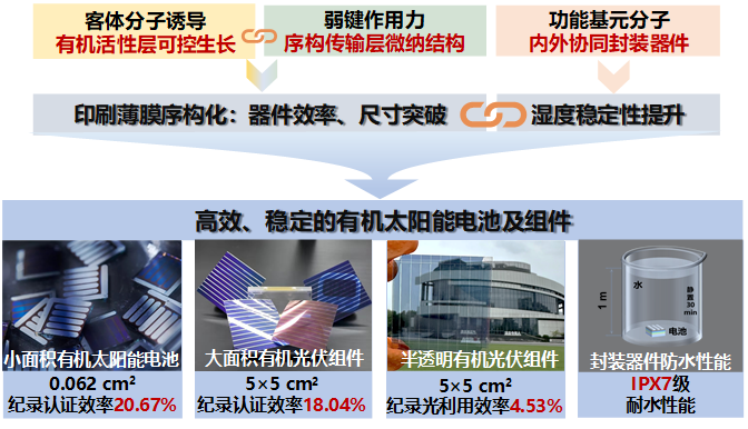 基于上述研究,多次创造世界纪录认证效率的小面积有机太阳能电池和大面积光伏组件,推动了有机光伏组件在建筑光伏一体化与移动能源中的实用化进程。
