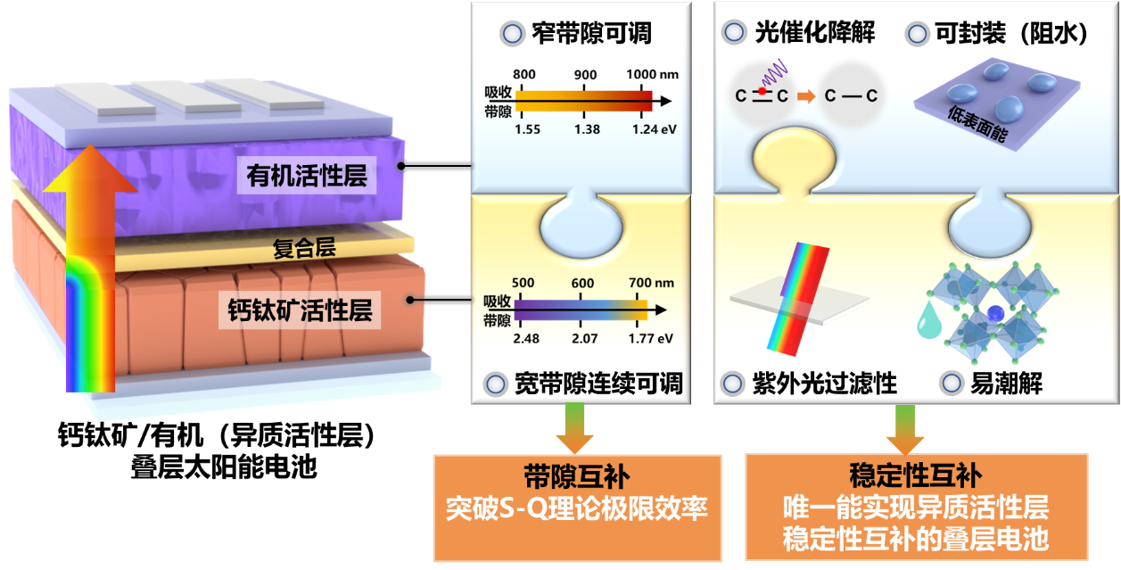 图1钙钛矿/有机叠层电池结构及活性层带隙、稳定性互补示意图