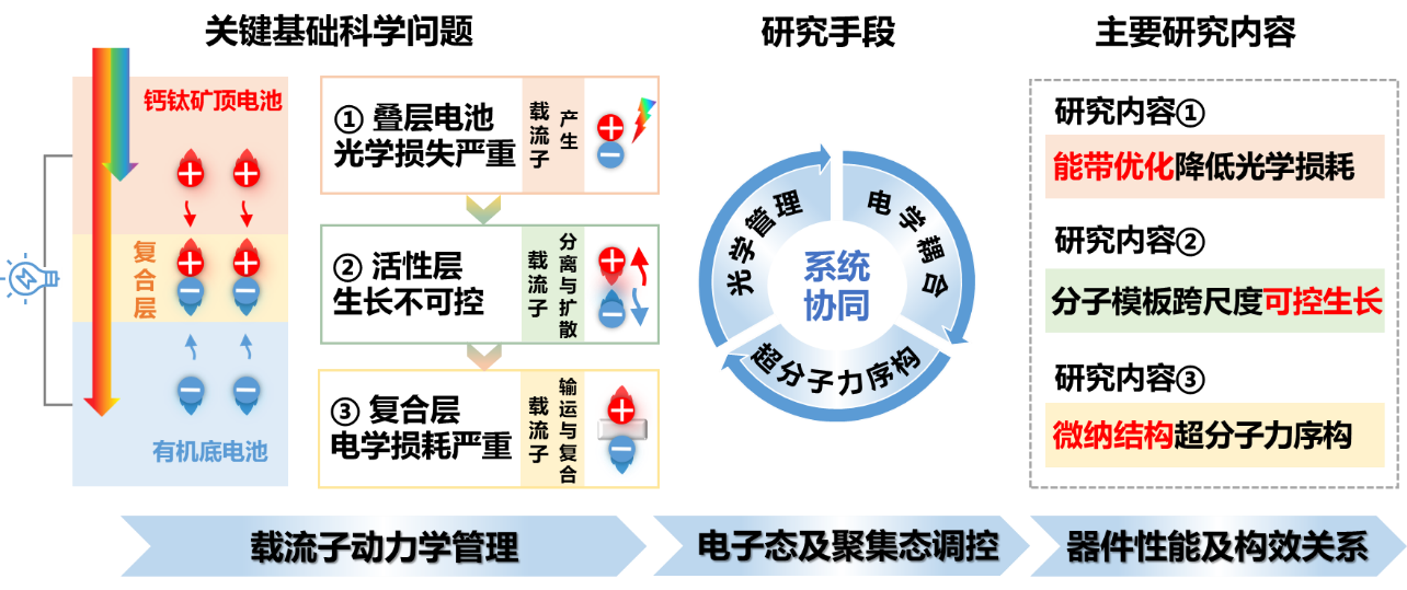围绕上述科学问题,本课题组以有机/聚合物、钙钛矿半导体材料体系为切入点,以发展具有功能导向的有机高分子材料为手段,借助超分子弱键作用力及其组装方法,实现了各功能层电子态与聚集态精准调控,全面改善了钙钛矿/有机叠层器件中载流子动力学(产生、扩散、复合)行为,主要研究思路如图2: