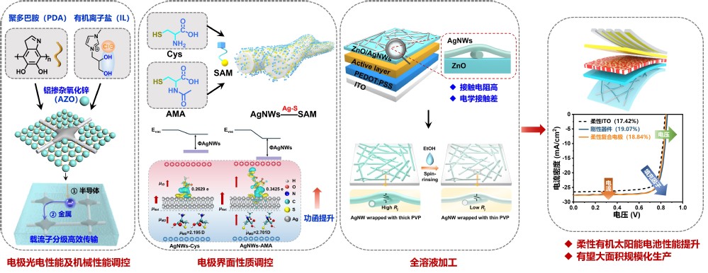 可穿戴技术和精密传感器的持续发展推动了对环保、可靠且具有良好机械稳定性的能源的需求。柔性有机太阳能电池因其优越的机械柔性和高功率转换效率,有希望成为高污染、不可再生的传统化石能源的有效解决方案。能够与各种器件和基板无缝集成的柔性有机太阳能电池,是便携式电子设备的绝佳选择。课题组围绕新型透明电极,对其光电性能、机械性能及界面性质进行优化,结合全溶液法加工工艺,制备出高性柔性有机太阳能电池并有望实现大面积可扩展高效柔性器件。在机械性能和光电性能方面,课题组利用离子液体在银纳米线结点处实现银原子级限域可控还原,采用聚多巴胺作为高分子胶水通过氢键、化学键诱导铝掺杂氧化锌在银纳米线电极骨架上组装,最终得到半导体-金属载流子分级高效传输且电级材料与基底黏附性能显著提升的复合柔性透明底电极;在界面性质方面,课题组基于带巯基自组装分子提升银纳米线电极基柔性电极功函及表面浸润性,有效缓解电极与界面层及活性层之间的能级失配并促进界面层在电极上的高质量成膜;最后,采用乙醇淋洗银纳米线去除部分表面绝缘聚合物层,并与氧化锌构成夹层顶电极,实现柔性有机太阳能电池的全溶液加工。通过多种策略显著提升银纳米线基柔性有机太阳能电池的性能,获得高效柔性器件并有望扩展化生产,为其潜在应用奠定坚实的技术基础。