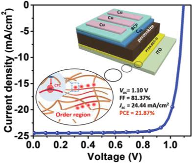 有机半导体材料由于具有低缺陷态密度、分子结构多样性、能级可调以及可溶液加工等优势,作为传输层被广泛应用于钙钛矿太阳能电池中。然而,由于有机半导体分子间作用力较弱,分子在成膜时排布杂乱无序,导致其薄膜无序能较大,进而降低了传输层的载流子迁移率,增加了器件的界面复合。这使得目前报道的p-i-n型钙钛矿器件效率远远低于n-i-p型钙钛矿器件效率。因此,如何调控有机半导体分子在薄膜中的排布,降低薄膜无序能,提高传输层的迁移率,降低器件界面复合是进一步提升p-i-n型钙钛矿太阳能电池效率的关键。