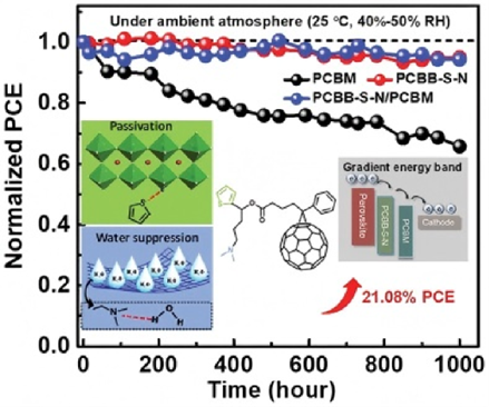 本工作基于路易斯酸PCBM主体框架结构,引入了路易斯碱噻吩和氨基等基团,合成了C60衍生物PCBB-S-N。研究发现,PCBB-S-N不仅对水具有更高的吸附能、可钝化钙钛矿Pb2+缺陷,而且还可以在钙钛矿上生长成致密的薄膜。同时,当PCBB-S-NPCBM构成双电子传输层,PCBMPCBB-S-N的诱导下,聚集行为显著改善。基于PCBB-S-N/PCBM双电子传输层,可实现对钙钛矿太阳能电池中的缺陷态进行“靶向治疗”,不仅实现了电池效率的显著提升,而且电池的光、热、湿度稳定性都获得了显著改善。该工作表明,所提出的具有精细调整化学结构的富勒烯衍生物有望成为有前途的电子传输层,以构筑稳定高效的钙钛矿太阳能电池。