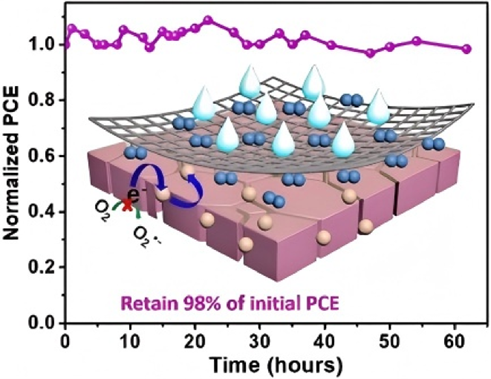 针对空气环境中钙钛矿活性层与超氧化物发生化学反应导致钛矿太阳能电池(pero-SCs)稳定性差的问题,本工作设计合成PCBB-OEG掺杂剂。PCBB-OEG加速了钙钛矿薄膜中的光电子传输,增强了电子传输层的电子提取能力,并有效防止电子与氧之间的反应形成超氧化物。基于该策略制备的pero-SC的最佳光电转换效率为20.49%。同时,PCBB-OEG改善了钙钛矿薄膜的抗氧稳定性,对应的未封装器件在环境空气中储存60天后仍保持初始效率的98%。