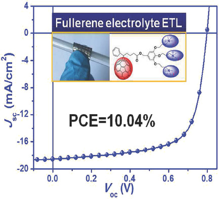 为了实现高性能的大面积柔性聚合物太阳能电池(PSC),挑战之一是开发膜厚不敏感以及可室温制备的新型界面材料。本文通过酯化反应在PC61BM上引入叔胺末端基团,经过碘甲烷的离子化反应成功合成了具有不同离子化数量的自掺杂PCBB-N-I和PCBB-3N-3I电解质材料。其中,高自掺杂含量的PCBB-3N-3I用于PSC的电子传输层时表现出优异的导电性能、无需热退火、膜厚不依赖以及良好机械性能的优点,并实现了在全室温下制备高性能的柔性PSC,获得10.04 %的高效率。并且光伏特性对PCBB-3N-3I ETL的厚度不敏感,对于厚PCBB-3N-3I ETL(61 nm)的器件,其效率为9.32%。此外,带有PCBB-3N-3I ETL的柔性PSC还显示出良好的机械性,为高性能柔性太阳能电池的未来开发铺平道路。