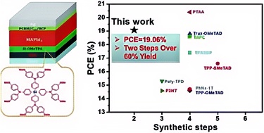 有机空穴传输层(HTL)对于实现高性能、低成本的平面p-i-n钙钛矿太阳能电池(pero-SCs)具有重要意义。本文合成了两种具有硅芯和三苯胺(TPA)衍生物分支的x形有机HTL材料Si-OMeTPA和SiTP-OMeTPA。这种分子设计策略可以简化合成过程,降低设备成本。尤其是Si-OMeTPA,可以从商业原料中通过两步合成,总收率超过60%。这种分子设计的Si-OMeTPA具有高热稳定性、高结晶度、长范围有序层状结构和优异的空穴迁移率等优点。所得的HTL还可以促进高质量钙钛矿薄膜的顺序生长,显著增强其光伏性能;制备的平面p-i-n pero-SCs效率达到19.06%,并具有可忽略的滞后,良好的再现性和稳定性。