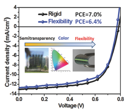 聚合物太阳能电池(PSCs)具有独特的半透明和着色特性,使其成为美学窗口应用的潜在候选者。本文通过高质量的混合金/银透明顶电极和精细调制的介电镜(dm)制备了倒置半透明PSCs。结果表明,通过将活性层中聚合物供体的带隙与dm特别设计的最大反射中心波长相匹配,可以定制器件的颜色,并且可以增强PSCs中的光吸收能力。基于PTB7-Th:PC71BM的倒置半透明PSCs具有6对dm,其最佳光电转换效率(PCE)为7.0%,平均可见光透过率(AVT)为12.2%。这种效率是半透明PCE中报道的最高效率之一,相当于不透明对应器件的81.4%。该器件的设计和加工方法也成功地适应了柔性基板,从而使器件的PCE为6.4%,AVT为11.5%。据我们所知,这个PCE值是报道的柔性半透明PSC的最高值。