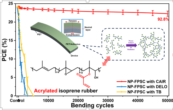 柔性钙钛矿太阳能电池(FPSCs)因其优异的光电性能、轻质设计以及高比功率密度,在可穿戴设备、建筑一体化光伏以及移动能源系统等领域具有巨大的应用潜力。然而,在实际应用中,FPSCs在频繁弯曲等机械应力作用下,其功能层易遭受应力破坏,导致结构失效和光电转换效率下降。为缓解这一问题,研究者们引入了中性层(NP)概念,通过将功能层置于器件中心,并在顶部金属电极上通过粘合剂引入保护层来减少弯曲时的应力集中。但即便如此,粘合剂在多次弯曲循环中的脱附问题依然存在,且其背后的机制尚未明确。李耀文教授团队针对这一难题展开了深入研究。他们发现,商业粘合剂因杨氏模量高、粘附强度低,在弯曲过程中难以承受层间剪切应力,从而引发粘合剂与电极之间的脱粘现象。为攻克这一瓶颈,团队设计了一种可交联聚合物丙烯酸酯异戊橡胶(AIR)。该材料具有长线性聚异戊二烯主链和丙烯酸酯侧链,兼具高柔韧性和低链段运动性。在紫外光照射下,AIR能够交联形成稳定的网络结构,具备极低的杨氏模量和高粘附强度,从而确保保护层与FPSCs之间形成牢固的结合,构建出稳定的NP-FPSCs。实验结果表明,采用AIR粘合剂的NP-FPSCs展现出了卓越的机械稳定性。在曲率半径为4毫米的条件下,经过50000次弯曲循环后,其仍能保持初始效率的92.8%,符合国际电工委员会IEC 62715-6-3标准,并刷新了柔性钙钛矿太阳能电池机械稳定性的纪录。这一成果不仅在柔性钙钛矿太阳能电池领域实现了重大突破,更为其他柔性光电子器件的开发提供了宝贵的借鉴,有望推动柔性能源技术的进一步发展和商业化应用。